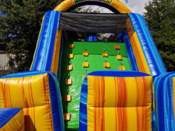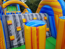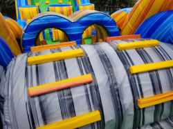 This version of our popular Radical Run features 65 feet of radical obstacles and a giant 16-foot-tall rock climb feature with a double lane slide. Participants are challenged with a wide variety of challenging obstacles such as tunnels, pop-ups, logs, sqeeze-throughs, climb-overs, and the two different slides. It also features the very unique person-shaped hole to jump through! This is great choice for schools, churches, company picnics, neighborhood parties, or charity events, but can still fit in some backyards.