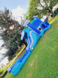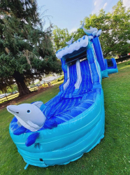 You have arrived at Dolph Land. The Dolphins Dual Lane Combo has arrived just in time to make a splash! The dolphins are a perfect match for the ocean blue vinyl that gives this material its name. This combo is an excellent choice for any event or party with an ocean theme because it comes complete with elements like a dual-lane slide, bounce house, and obstacle pop-ups.