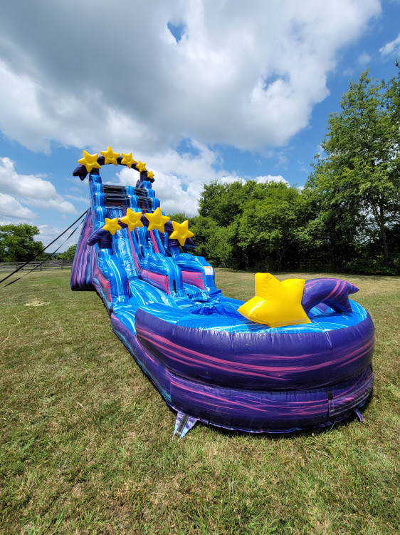 Want to do something really out of this world? If so, the Galaxy Star Water Slide is a must-have for your next party! This gigantic inflatable slide has a space design and is over 20 feet in height. The Galaxy Star is a great slide for kids, and its padded walls, cushioned landing area, and large pool make it safe for adults, too. Whether you're throwing a birthday bash or a work picnic, the Galaxy Star Water Slide is sure to be a hit. Everyone above the age of five is welcome to join in the merriment.