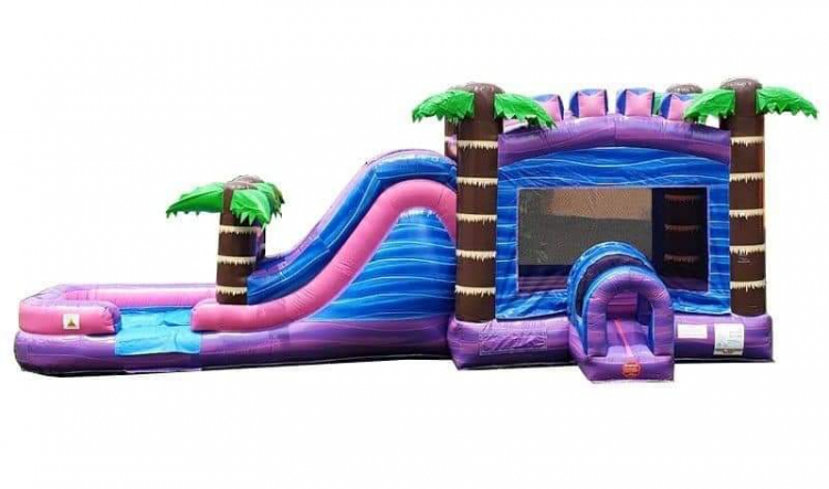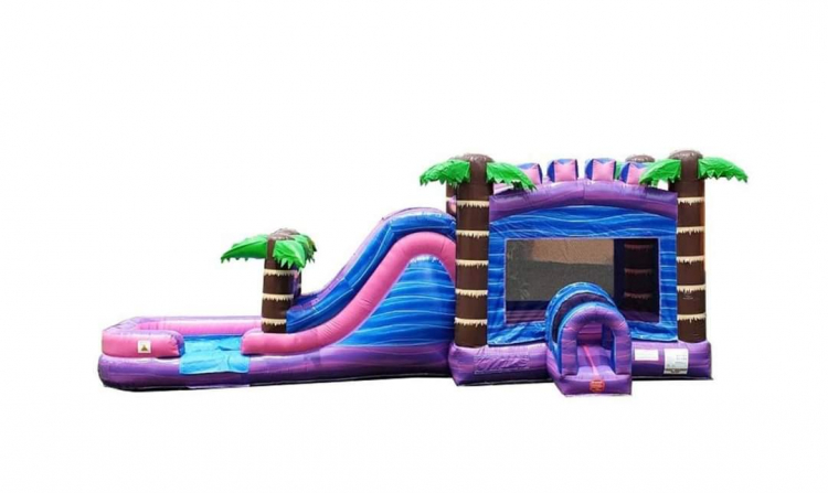 The Mega Tropical Purple Marble Water Slide Bounce House Combo MEGA SIZES the fun and excitement of leaping and playing in a water slide bounce house! Kids are in awe of these units due to their vivid, bright colors, large bouncing area, and very entertaining big slide. The 32' feet of entertaining, engaging activities on this unit might even make some parents secretly want to jump in! Crawl through our renovated, enclosed tunnel entrance into the bouncing section. On this gigantic bouncer, have a blast laughing, jumping, and bouncing all day long! To see the water rushing down the slide, climb up the short granite wall. Prepare, then descend to the splash area at the bottom for the big finish and some pictures for the scrapbook! The Mega Tropical Purple Marble Water Slide Bounce House Combo provides all the fun that kids (and parents!) desire for a fun, thrilling, and unforgettable play day. It also ensures that the party runs smoothly.