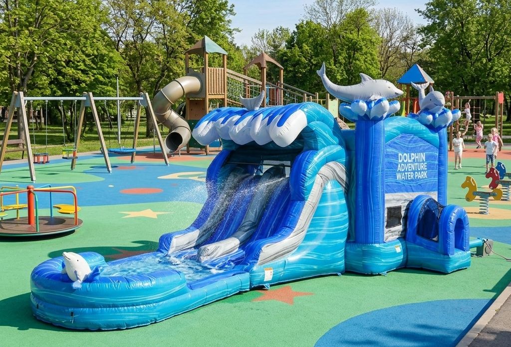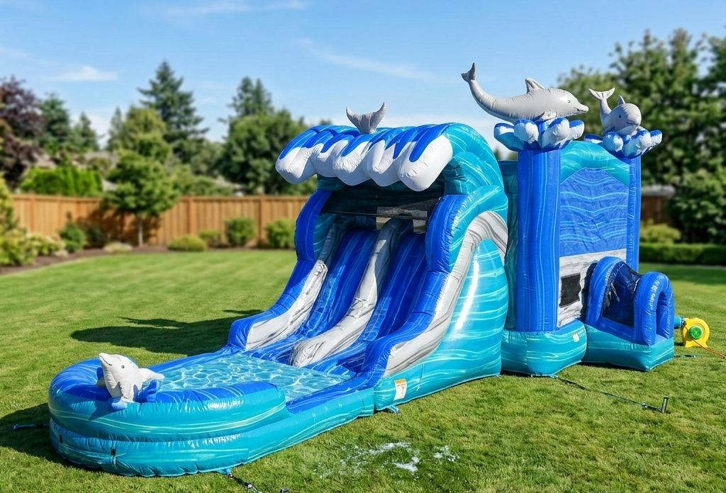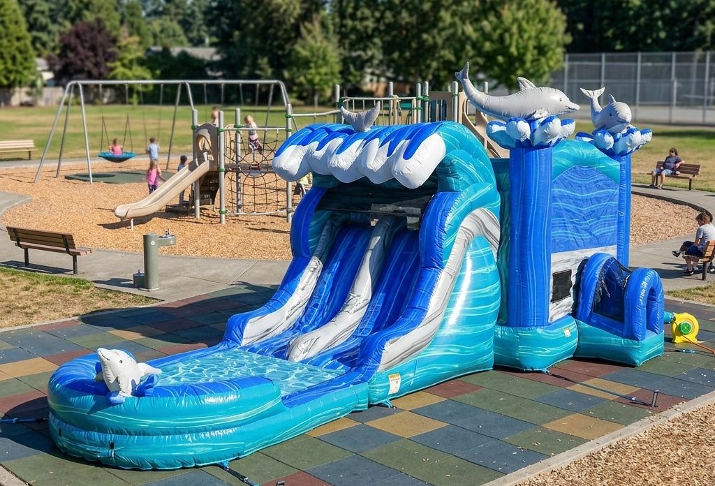 - Ocean-Themed Dual Lane Combo: A dolphin-designed 35ft inflatable with a dual-lane slide and bounce house all in one!
