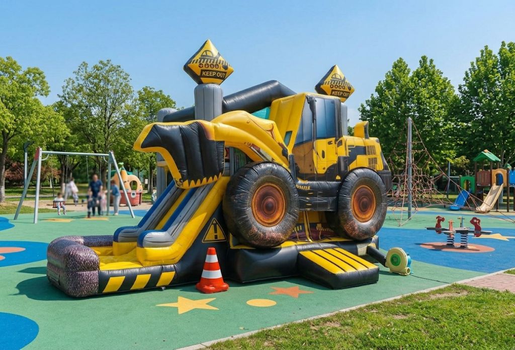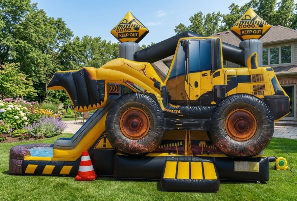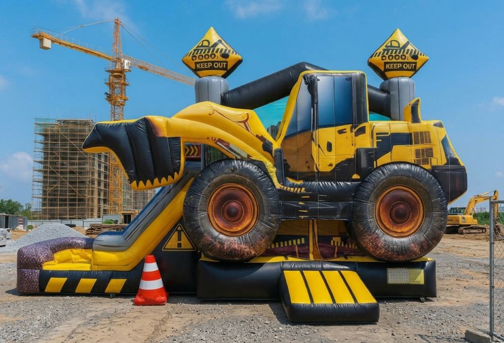 - Construction Zone Bounce Combo: A bold black, gray and yellow themed inflatable with a realistic 3D skid loader design!