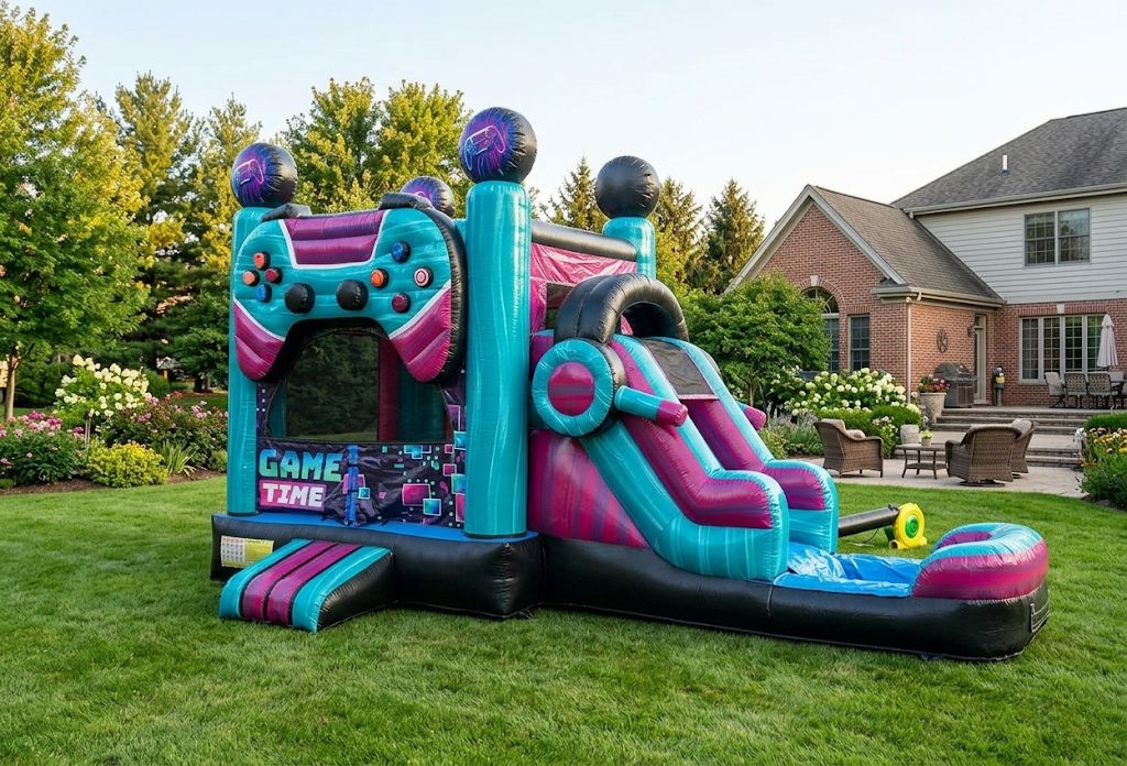 - Gamer Themed Bounce Combo: A controller-themed inflatable with pixel-perfect graphics that every young gamer will love!