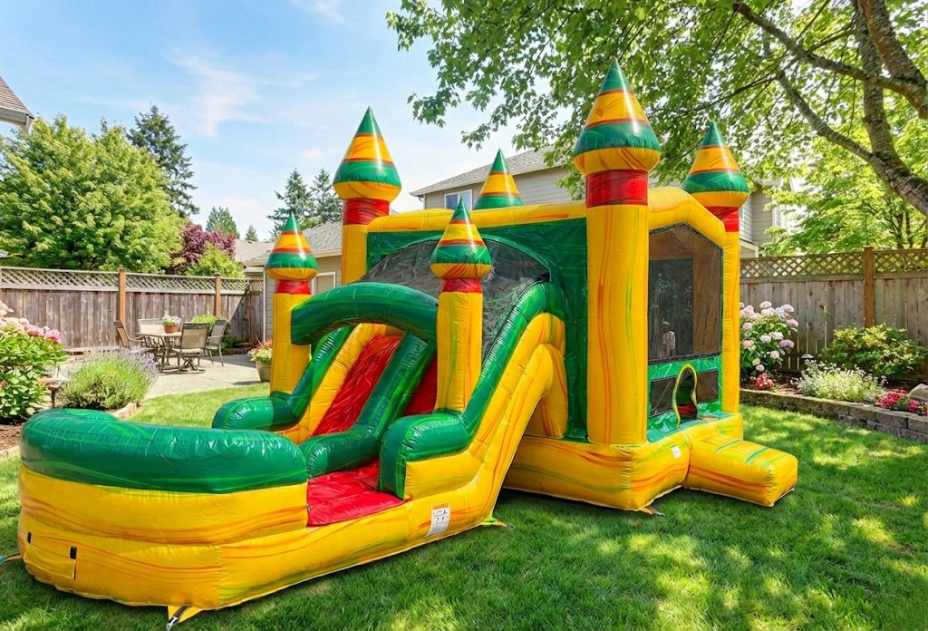 - Vibrant Fiesta Combo Bounce House: A colorful, festive inflatable with a dual-lane slide and a built-in basketball hoop!