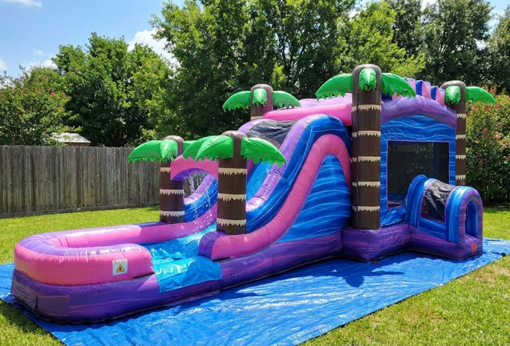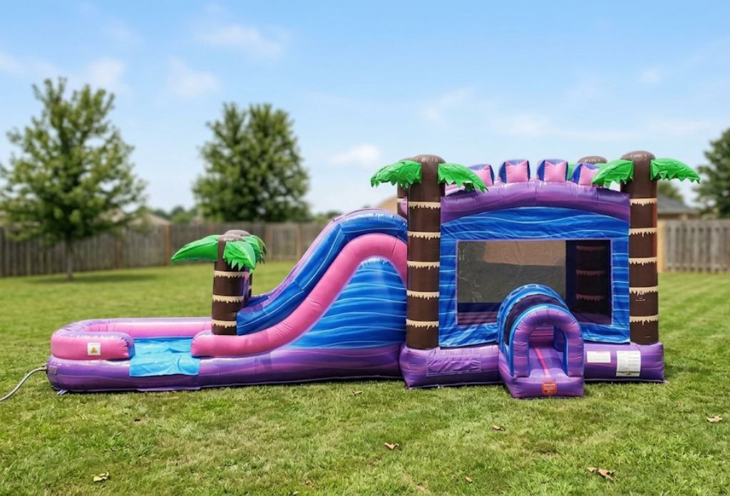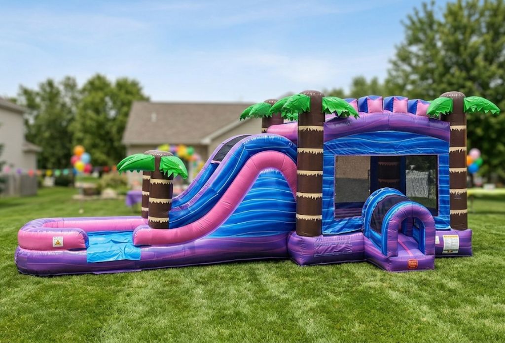 - Tropical Purple Bounce and Slide Combo: A vibrant 32ft tropical themed inflatable that brings bold color and big fun!